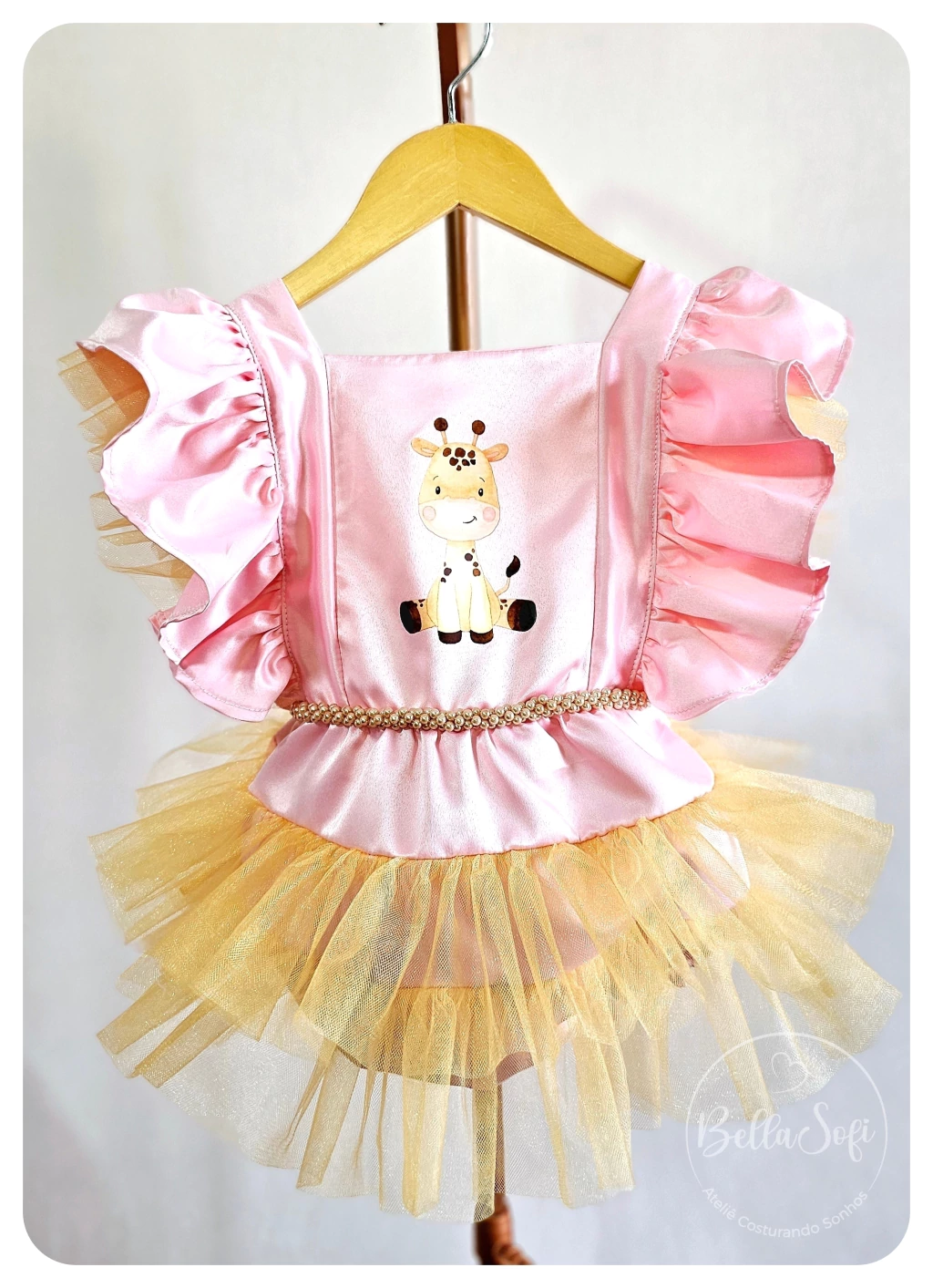Bombacha/romper em tecido bucol e tule, com aplicação e cinto de pérolas bordado.