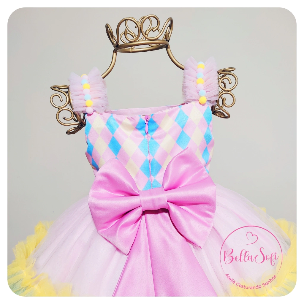 Vestido em tecido 100% algodão e Tule, com aplicação de pompons.