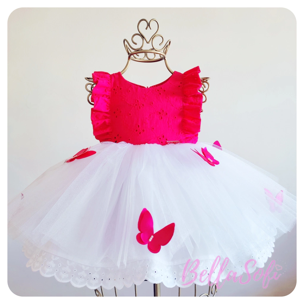 Vestido infantil, modelo festa com detalhes, corpo em Laise bordada 100% algodão, com saia de tule com barra de renda e aplicação de borboletas. Laço estruturado podendo ser removível nas costas, forro interno em tecido 100% algodão, com duas camada de filó entre o forro e o tecido para deixar o vestido armado, costas fechada com zíper, confeccionado com alta-costura e acabamento fino.