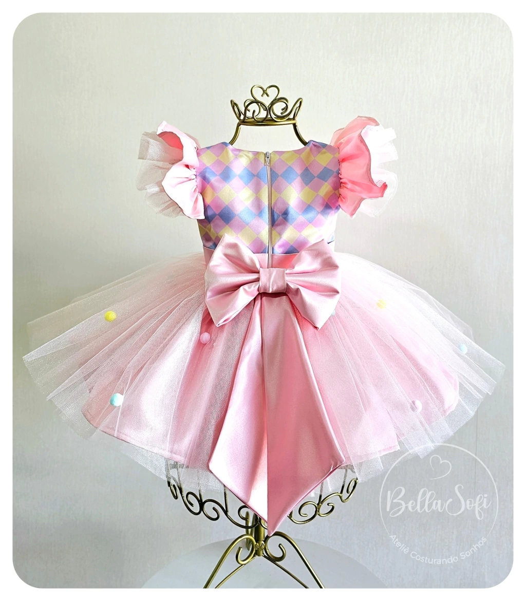 Vestido em tecido 100% algodão e Tule, com aplicação de pompons.