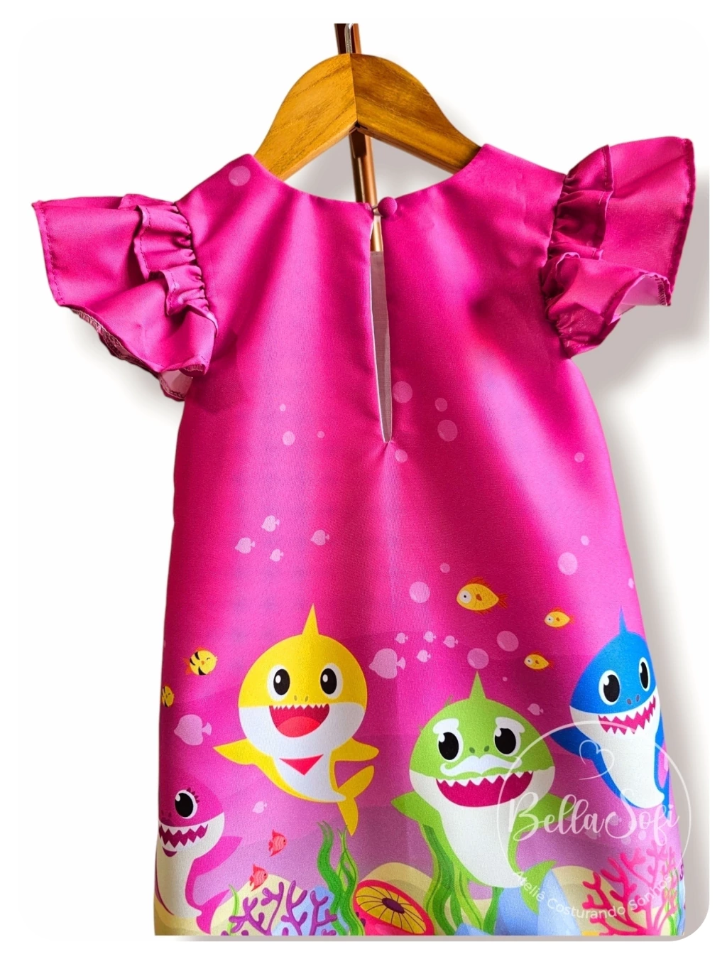 Características: Vestido infantil, modelo Trapézio, tema Baby Shark, cor predominante pink, tecido Poliéster, costas fechada com botão, forro em tecido 100% algodão, confeccionado com alta-costura e acabamento fino.