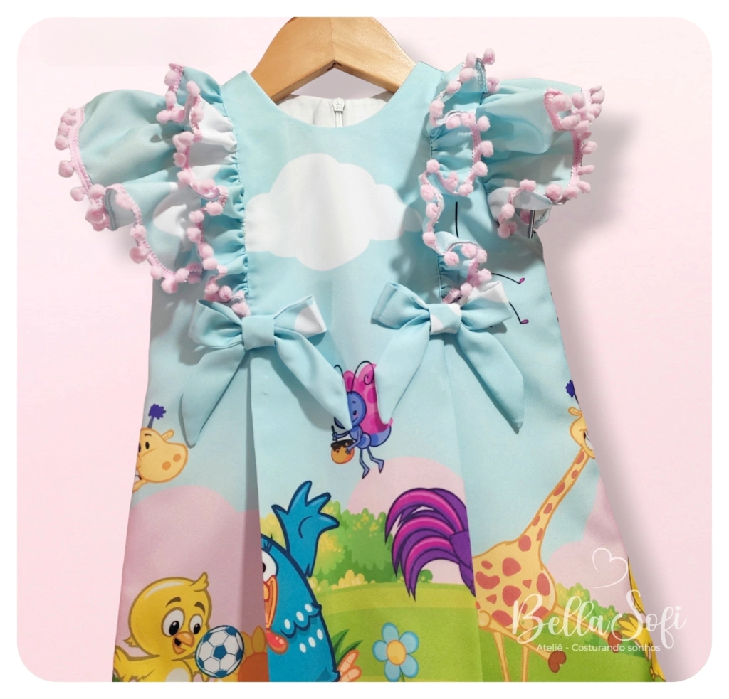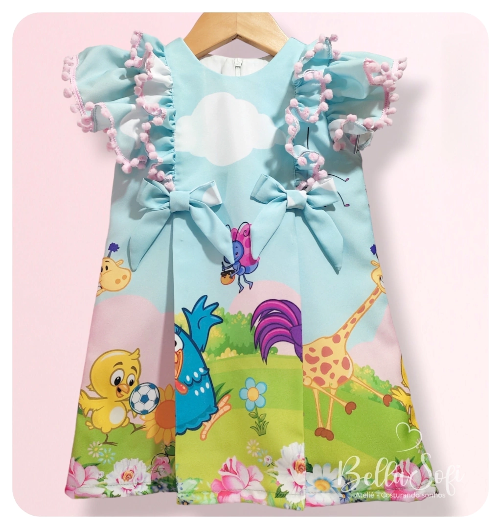 Características: Vestido infantil, modelo Trapézio, tema Galinha Pintadinha cor predominante Azul, tecido Poliéster, detalhes em pompom, costas fechadas com botão, forro em tecido 100% algodão, confeccionado com alta costura e acabamento fino.