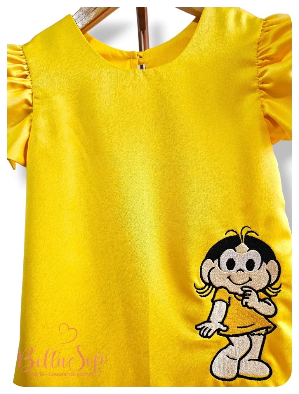 Características: Vestido infantil, modelo Trapézio, tema Magali, com bordado da Magali, cor predominante Amarelo, tecido Crepe, costas fechada com Botão, forro em tecido 100% algodão, confeccionado com alta-costura e acabamento fino.