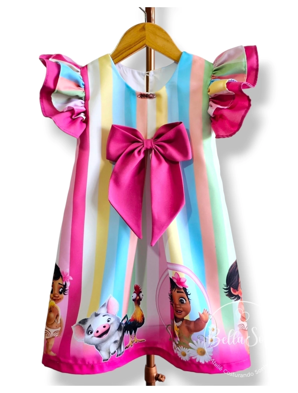 Características: Vestido infantil, modelo Trapézio, tema Moana Baby, tecido Poliéster, costas fechada com botão, forro em tecido 100% algodão, confeccionado com alta-costura e acabamento fino.