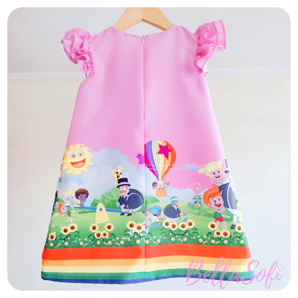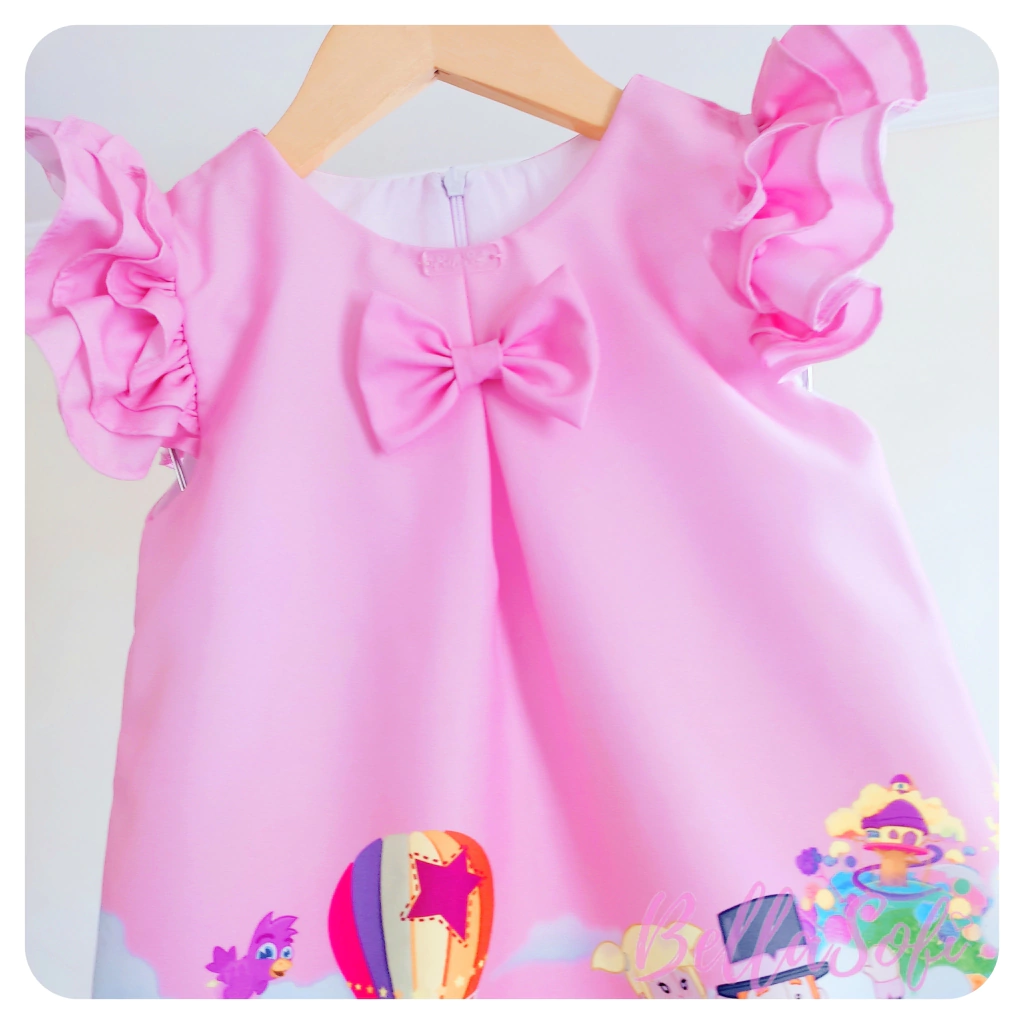 Características: Vestido infantil, modelo Trapézio, tema Mundo Bita, cor predominante rosa, tecido Oxfordine, costas fechada com zíper, forro em tecido 100% algodão, confeccionado com alta-costura e acabamento fino.