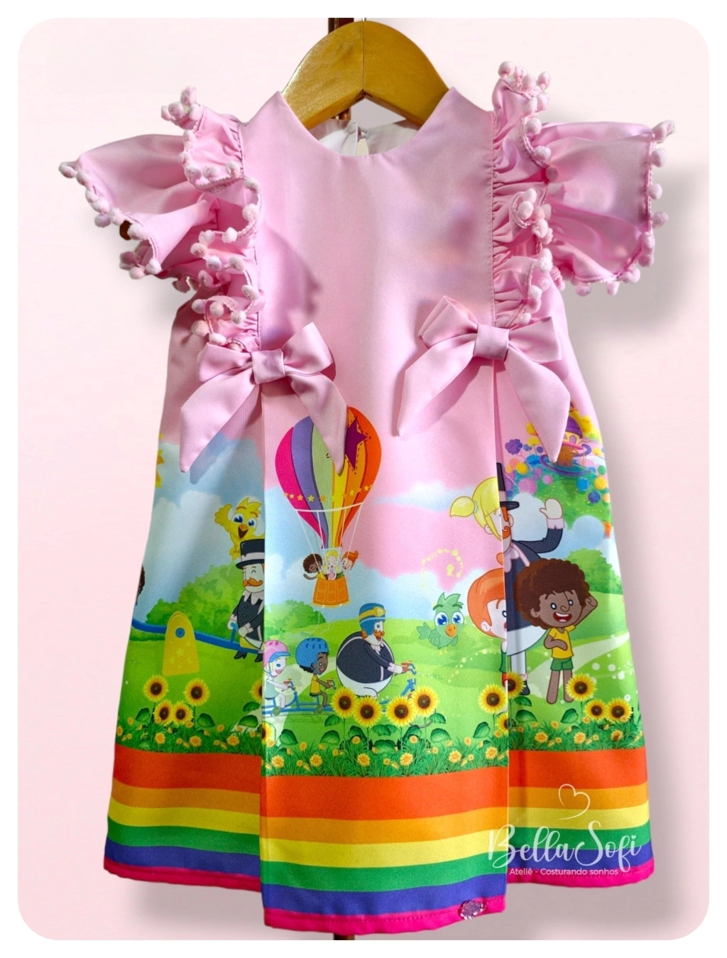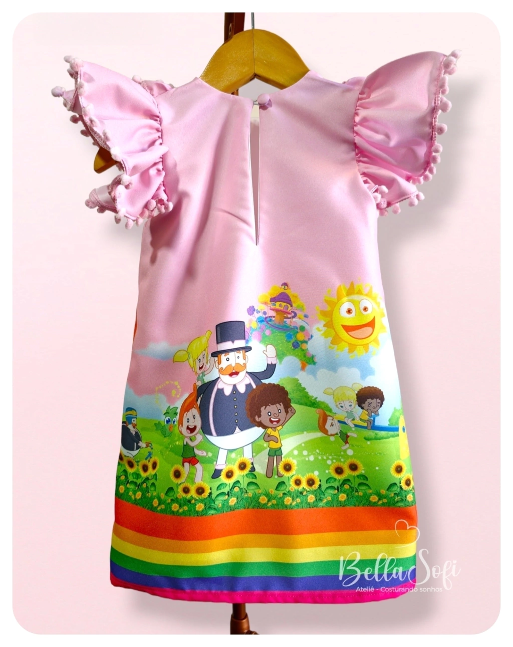 Características: Vestido infantil, modelo Trapézio, tema Mundo Bita, cor predominante rosa, tecido Poliéster, detalhes em pompom, costas fechadas com botão, forro em tecido 100% algodão, confeccionado com alta costura e acabamento fino.