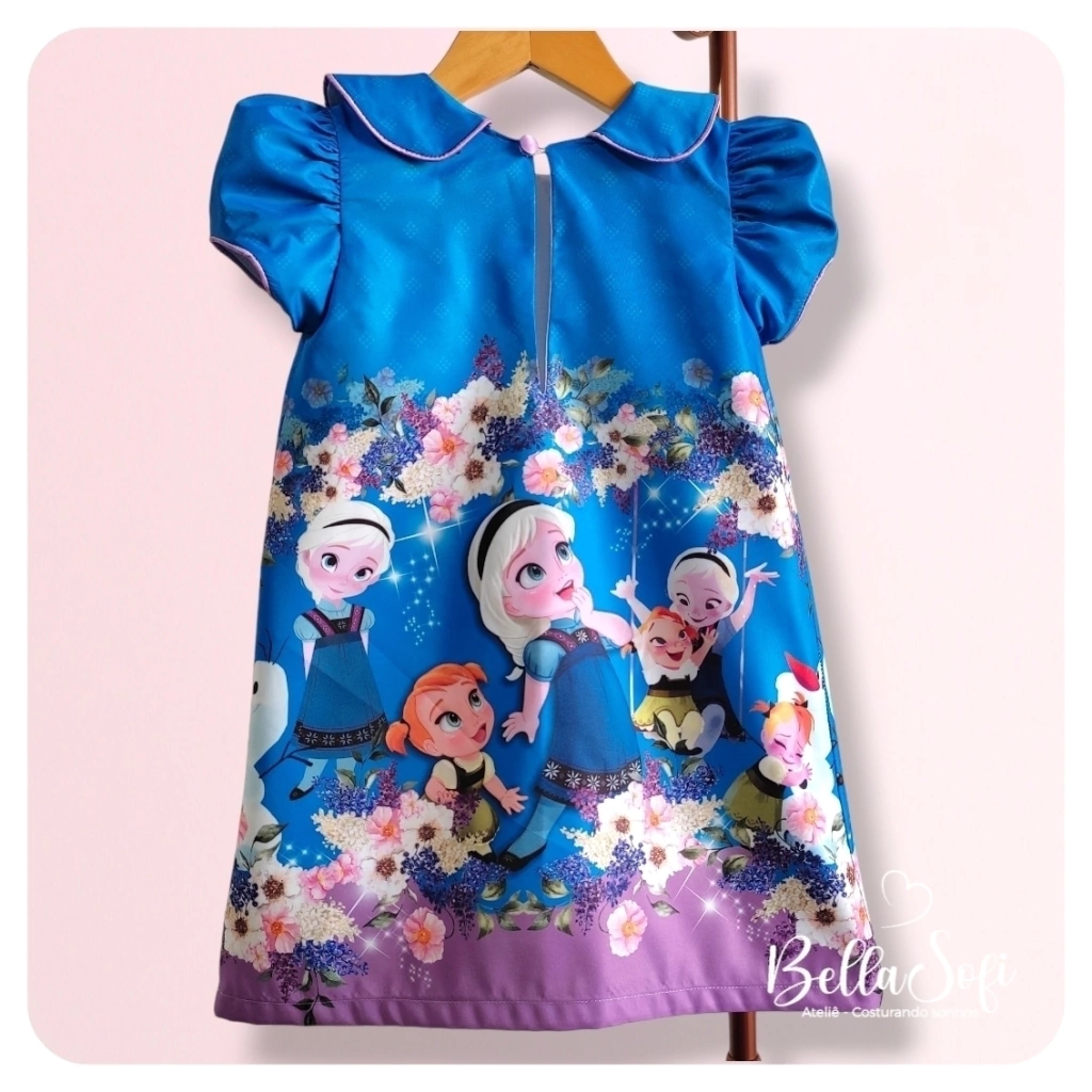 Características: Vestido infantil, modelo Trapézio, tema Frozen, cor predominante azul, tecido Prada satin, costas fechada com botão, forro em tecido 100% algodão, confeccionado com alta-costura e acabamento fino.