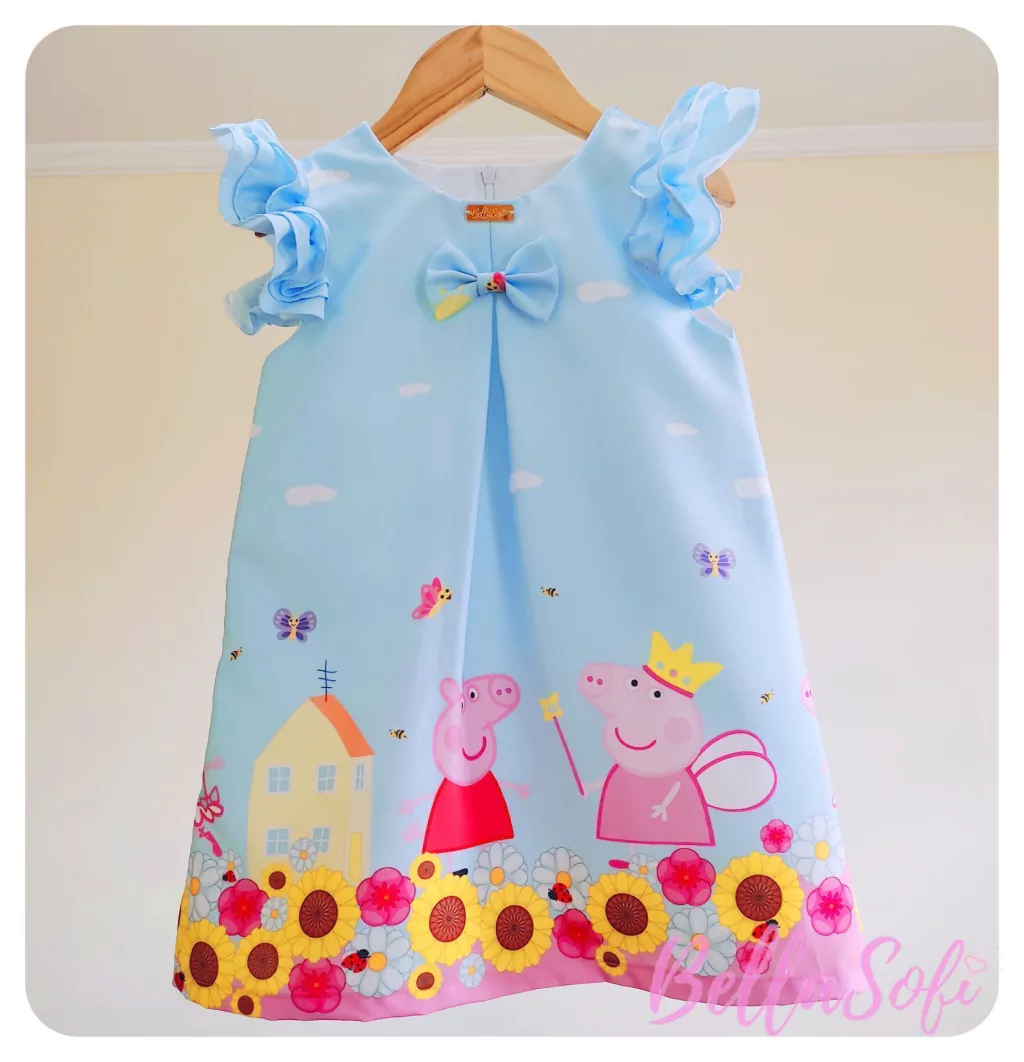 Características: Vestido infantil, modelo Trapézio, tema Peppa Pig, cor predominante Azul, tecido oxfordine, costas fechada com zíper, forro em tecido 100% algodão, confeccionado com alta-costura e acabamento fino.