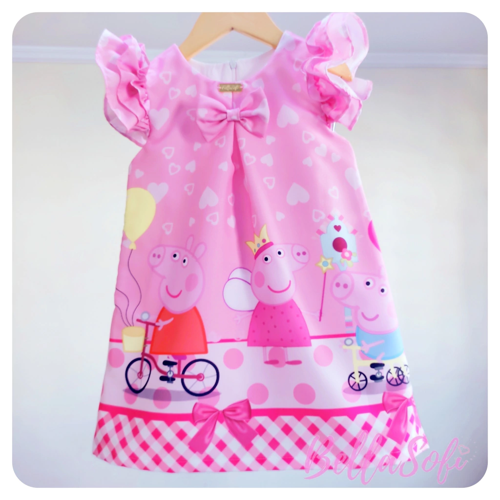 Características: Vestido infantil, modelo Trapézio, tema Peppa Pig, cor predominante Rosa, tecido oxfordine, costas fechada com zíper, forro em tecido 100% algodão, confeccionado com alta-costura e acabamento fino.
